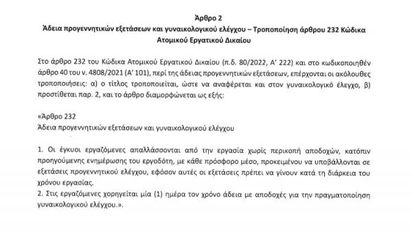 Η συγκεκριμένη τροπολογία αφορούσε το άρθρο 232 του Κώδικα Ατομικού Εργατικού Δικαίου, το οποίο αφορά την άδεια για προγεννητικές εξετάσεις και για γυναικολογικό έλεγχο.