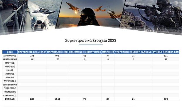 Είναι χαρακτηριστικό το γεγονός ότι τον Ιανουάριο είχαν καταγραφεί 978 παραβιάσεις του Εθνικού Εναέριου Χώρου, ενώ τον Φεβρουάριο έπεσαν στις 163 κι αυτές, όπως προαναφέραμε, έγιναν τις πρώτες ημέρες το μήνα. Τον Μάρτιο, καμία. Αντιστοίχως οι παραβάσεις τον Ιανουάριο ήταν 238, τον Φεβρουάριο 46 και τον Μάρτιο καμία. Οι οπλισμένοι σχηματισμοί τον Ιανουάριο ήταν 66, τον Φεβρουάριο 9 και τον Μάρτιο καμία. Οι εμπλοκές τον Ιανουάριο ήταν 74, τον Φεβρουάριο 14 και τον Μάρτιο καμία, ενώ οι υπερπτήσεις εθνικού εδάφους τον Ιανουάριο 21, ενώ τον Φεβρουάριο και τον Μάρτιο, μηδέν.