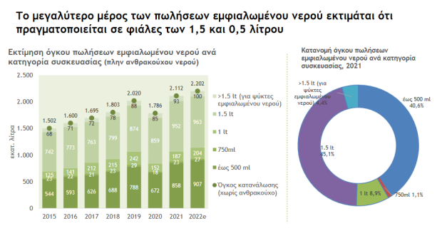 Την περσινή χρονιά οι πωλούμενες ποσότητες εμφιαλωμένου νερού ανήλθαν σε 2.247 εκατ. λίτρα κατά 4,2% αυξημένες σε σχέση με το 2021.