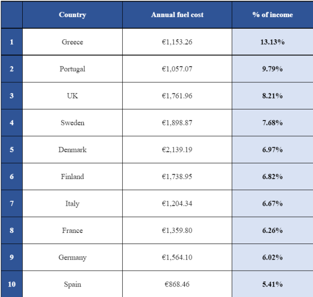 Συγκεκριμένα, οι οδηγοί στην Ελλάδα ξοδεύουν κατά μέσο όρο το 13,13% του ετήσιου εισοδήματός τους σε καύσιμα κάθε χρόνο. Αυτό είναι το μεγαλύτερο ποσοστό όλων των ευρωπαϊκών χωρών που αναλύθηκαν. Η τιμή ανά λίτρο καυσίμου στην Ελλάδα (2,40€) είναι η τρίτη υψηλότερη στην Ευρώπη. Αυτό είναι μόνο φθηνότερο από τη Φινλανδία (2,53 € ανά λίτρο) και την Ολλανδία (2,48 € ανά λίτρο).