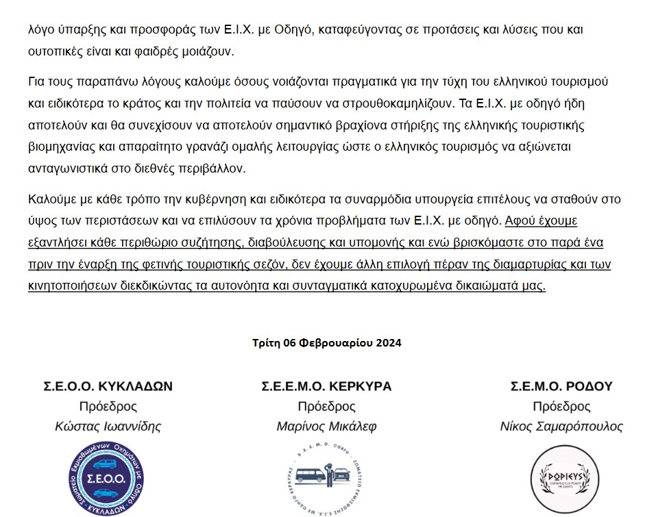 Ομοσπονδία Εκμισθωμένων Ε.Ι.Χ με Οδηγό: Δεν έχουμε άλλη επιλογή πέραν της διαμαρτυρίας και των κινητοποιήσεων