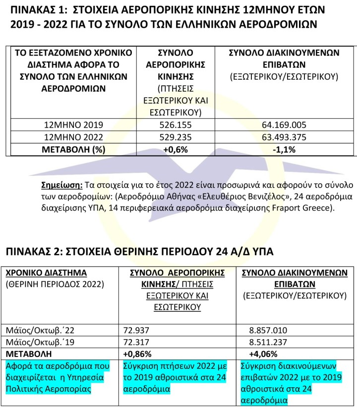 Όσον αφορά στο σύνολο των διακινούμενων επιβατών στα ελληνικά αεροδρόμια, (αφίξεις και αναχωρήσεις επιβατών εξωτερικού και εσωτερικού), από τα στοιχεία για το έτος 2022 προκύπτει ότι διακινήθηκαν 63.493.375 εκατομμύρια επιβάτες, έναντι 64.169.005 το 2019, σημειώνοντας οριακή μείωση -1,1%.