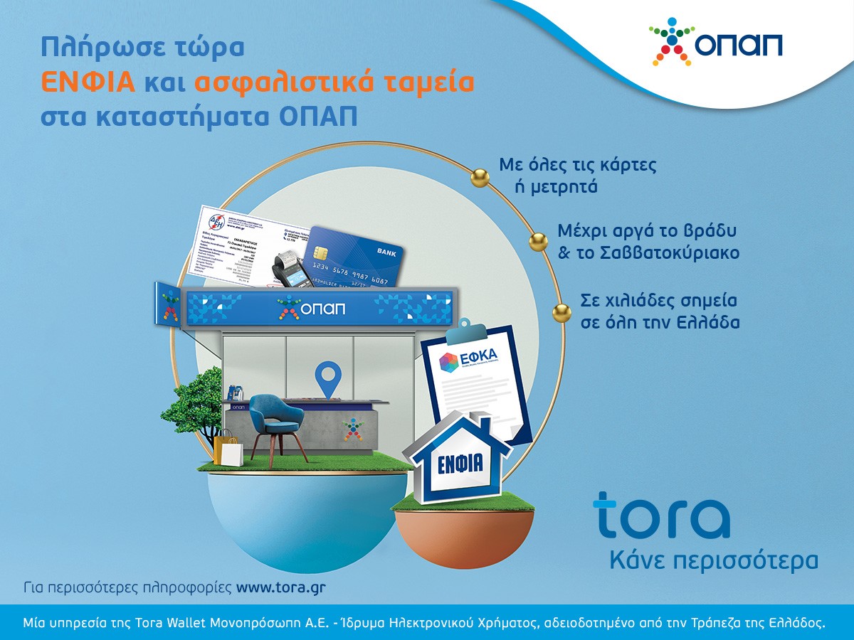 Η  υπηρεσία πληρωμής λογαριασμών της ToraWallet, η οποία είναι διαθέσιμη σε περίπου 3.000 καταστήματα ΟΠΑΠ σε όλη την Ελλάδα, δίνει τη δυνατότητα για πληρωμές μέσω χρεωστικής, πιστωτικής ή προπληρωμένης κάρτας, αλλά και με μετρητά. Επιπλέον, το ωράριο λειτουργίας του δικτύου ΟΠΑΠ προσφέρει ευελιξία, καθώς επιτρέπει την πληρωμή φόρων και λογαριασμών τις καθημερινές, αλλά και τα σαββατοκύριακα, μέχρι αργά το βράδυ.