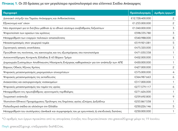 Στις είκοσι πρώτες δράσεις με τον μεγαλύτερο προϋπολογισμό κάποιος συναντάει συνολικά τέσσερις δράσεις οι οποίες έχουν σχέση με τον ψηφιακό μετασχηματισμό του κράτους. Είναι η “ψηφιοποίηση των αρχείων” (αφορά την ψηφιοποίηση αρχείων της πολεοδομίας, των υποθηκοφυλακείων και της μετανάστευσης, με προϋπολογισμό €600 εκατ.), ο ψηφιακός μετασχηματισμός των μικρομεσαίων επιχειρήσεων (επιδοτεί σχετικές δαπάνες – €465 εκατ.), ο ψηφιακός μετασχηματισμός της εκπαίδευσης (με έργα για την προμήθεια διαδραστικών συστημάτων και εξοπλισμού ρομποτικής, αλλά και τη γνωστή “ψηφιακή μέριμνα” που επιδοτεί ηλεκτρονικό εξοπλισμό μαθητών και φοιτητών – €377 εκατ.) και ο ψηφιακός μετασχηματισμός της υγείας (ηλεκτρονικός φάκελος, τηλεϊατρική, ψηφιοποίηση ΕΟΠΥΥ, κ.ά., – €344 εκατ.).