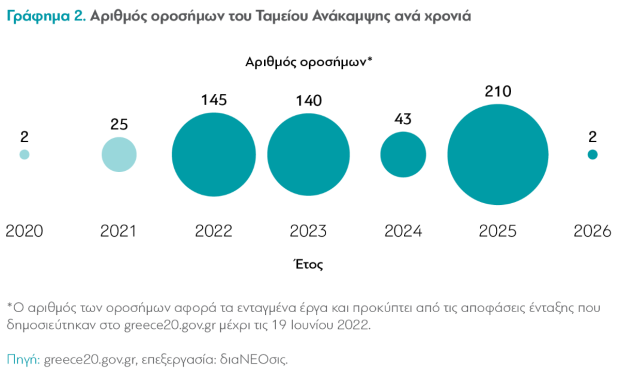 Ο ευρωπαϊκός Μηχανισμός Ανάκαμψης και Ανθεκτικότητας (RRF), το λεγόμενο “Ταμείο Ανάκαμψης”, πρόκειται να χρηματοδοτήσει με εκατοντάδες δισεκατομμύρια ευρώ χιλιάδες επενδύσεις και μεταρρυθμίσεις στις χώρες της Ευρωπαϊκής Ένωσης. Στην Ελλάδα μέχρι στιγμής* έχει αποφασιστεί η ένταξη περισσότερων από 300 έργων στο πλαίσιο 105 ευρύτερων δράσεων, με συνολικό προϋπολογισμό περίπου €22 δισ. Τα έργα αυτά είναι προγραμματισμένο να ολοκληρωθούν μέχρι το 2026 και συνοδεύονται από περισσότερους από 550 επιμέρους στόχους ή ορόσημα για την πρόοδό τους.