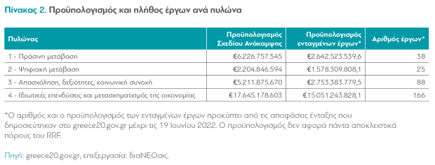 Η ανάλυση των δράσεων δίνει, ασφαλώς, μια εικόνα για τη γενικότερη φύση των έργων του Ταμείου Ανάκαμψης. Όμως η κατάταξη των έργων ανά πυλώνα, παρότι οι ενταγμένοι προϋπολογισμοί δεν ταυτίζονται πάντοτε με τη συμμετοχή του Ταμείου Ανάκαμψης, δίνει μια ενδεικτική εικόνα για το ποια μέρη του “Ελλάδα 2.0” προχωρούν πιο γρήγορα και ποια λιγότερο.