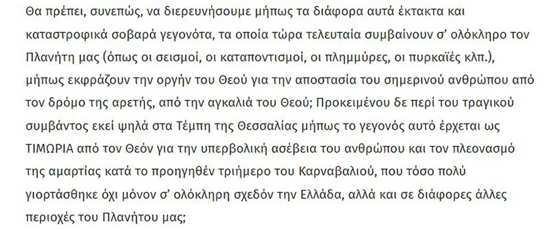 «Θα πρέπει, συνεπώς, να διερευνήσουμε μήπως τα διάφορα αυτά έκτακτα και καταστροφικά σοβαρά γεγονότα, τα οποία τώρα τελευταία συμβαίνουν σ’ ολόκληρο τον Πλανήτη μας (όπως οι σεισμοί, οι καταποντισμοί, οι πλημμύρες, οι πυρκαϊές κλπ.), μήπως εκφράζουν την οργήν του Θεού για την αποστασία του σημερινού ανθρώπου από τον δρόμο της αρετής, από την αγκαλιά του Θεού; Προκειμένου δε περί του τραγικού συμβάντος εκεί ψηλά στα Τέμπη της Θεσσαλίας μήπως το γεγονός αυτό έρχεται ως ΤΙΜΩΡΙΑ από τον Θεόν για την υπερβολική ασέβεια του ανθρώπου και τον πλεονασμό της αμαρτίας κατά το προηγηθέν τριήμερο του Καρναβαλιού, που τόσο πολύ γιορτάσθηκε όχι μόνον σ’ ολόκληρη σχεδόν την Ελλάδα, αλλά και σε διάφορες άλλες περιοχές του Πλανήτου μας;», αναφέρει και προσθέτει: «Μήπως, λοιπόν, αυτή η τραγωδία των Τεμπών είναι μια έκφρασις της οργής του Κυρίου μας γι΄αυτή την τόσο πανηγυρική Καρναβαλική εορτή του Διαβόλου;».