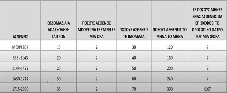 Από τους υπολογισμούς του ΙΣΑ προκύπτει ότι εάν οι ασθενείς εξετάζονταν ανά μισή ώρα, ο καθένας από αυτούς θα μπορούσε να επισκεφθεί τον προσωπικό ιατρό μία φορά κάθε επτά μήνες! Όπως ανέφερε ο Επ. Καθηγητής της Ιατρικής Σχολής Αθηνών, ΕΚΠΑ, Ταμίας Δ.Σ. του ΙΣΑ, Γεώργιος Μαρίνος, , το στενό περιθώριο των 15 λεπτών δίνεται ούτως ώστε να διπλασιαστεί η δυναμικότητα των επισκέψεων.