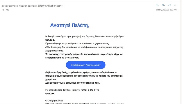 Αυτή τη φορά η απάτη έχει ως δόλωμα τον ιστότοπο gov.gr, με τους απατεώνες να στέλνουν μήνυμα σε πολίτες πως δήθεν έχουν επιστροφή φόρου.