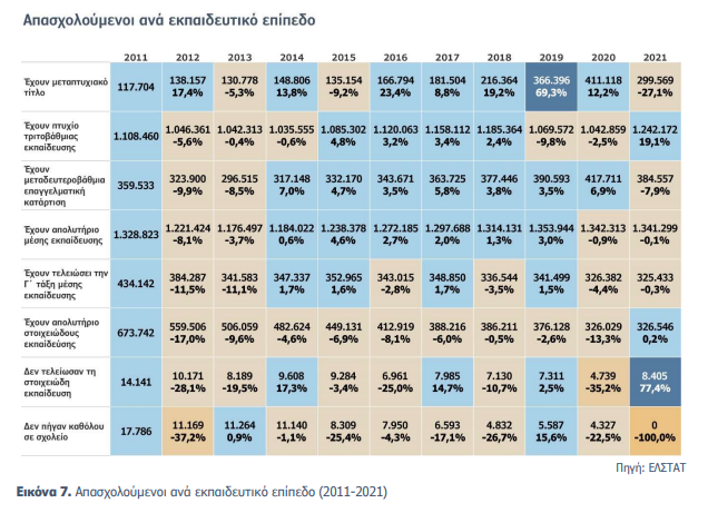 Οι απασχολούμενοι που δεν τελείωσαν την στοιχειώδη εκπαίδευση παρουσιάζουν διαχρονική μείωση από το 2011 (14.140) έως το 2020 (4.740) και αύξηση το 2021 (8.405). Οι απασχολούμενοι που δεν πήγαν καθόλου σχολείο παρουσιάζουν διαχρονική μείωση από το 2011 (17.790) έως το 2021 που σχεδόν εξαφανίζονται από την αγορά εργασίας.