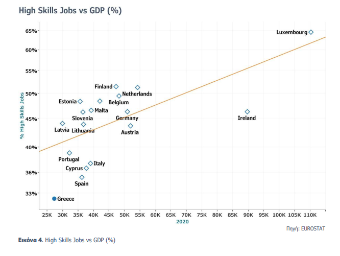 σημαντική συσχέτιση που υπάρχει ανάμεσα στην ευημερία μιας χώρας και στο μερίδιο των θέσεων εργασίας υψηλών δεξιοτήτων.