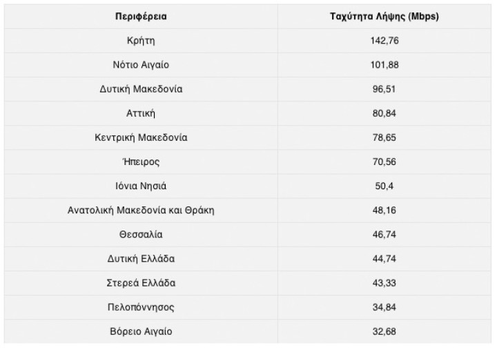 Ένας συνδρομητής στην Κρήτη ή στα νησιά της περιφέρειας Νοτίου Αιγαίου μπορεί να απολαμβάνει ταχύτητες λήψης που ξεπερνούν τα 100 Mbps, ενώ οι... άτυχοι κάτοικοι έξι περιφερειών της χώρας πρέπει να αρκούνται σε ταχύτητες χαμηλότερες από τα 50 Mbps.
