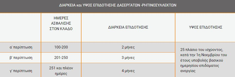 - Με βάση τα παραπάνω η διάρκεια της επιδότησης κυμαίνεται από δύο (2) έως τέσσερις (4) μήνες, όταν δεν υπάρχει επιδότηση εντός της τετραετίας. Εάν εντός της τετραετίας οι δασεργάτες/ρητινοσυλλέκτες έχουν επιδοτηθεί, αλλά έχουν λάβει λιγότερα από τετρακόσια (400) ημερήσια επιδόματα, δικαιούνται να επιδοτηθούν για τον υπόλοιπο αριθμό ημερησίων επιδομάτων μέχρι τη
