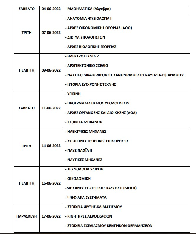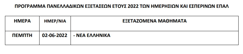 Το πρώτο μάθημα στο οποίο θα εξεταστούν οι υποψήφιοι των Γενικών Λυκείων είναι η Νεοελληνική Γλώσσα και Λογοτεχνία, την Παρασκευή 3 Ιουνίου. Μία ημέρα νωρίτερα, την Πέμπτη 2 Ιουνίου, ξεκινούν οι εξετάσεις για τους υποψηφίους των ΕΠΑΛ.