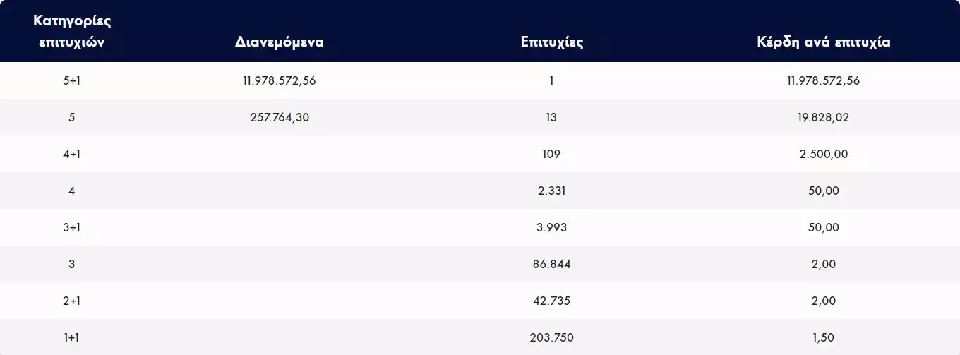 Ακόμη, 13 τυχεροί είναι οι νικητές της δεύτερης κατηγορίας, αφού πέτυχαν τα 5 νούμερα της κλήρωσης αλλά όχι τον αριθμό τζόκερ. Αυτοί θα γίνουν πλουσιότεροι κατά περίπου 19.828,02 ευρώ έκαστος, αφού θα διανεμηθούν 257.764,30 ευρώ.