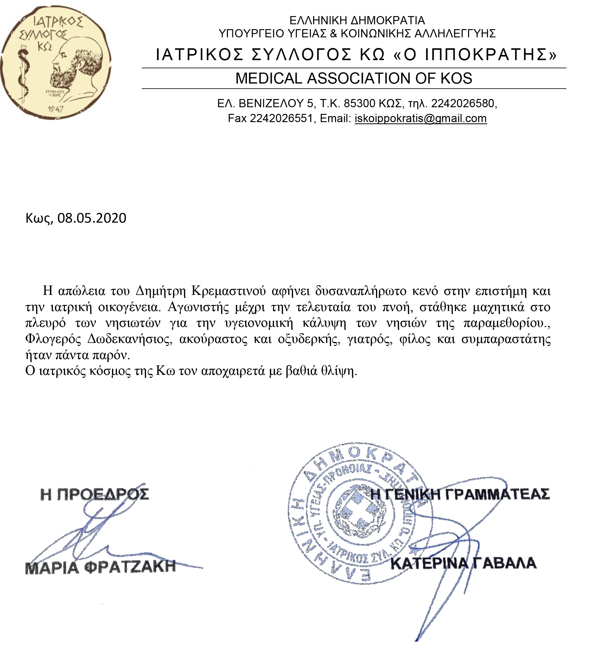 « Βαριά θλίψη προκαλεί σε όλους μας ο θάνατος του Δημήτρη Κρεμαστινού. Ως επιστήμονας, Υπουργός και Βουλευτής Δωδεκανήσου o Δημήτρης , μονίμως ακούραστος διέθετε όλες του τις δυνάμεις για την Ιατρική και τα νησιά μας. Η απουσία του θα είναι διαρκώς αισθητή. Οι χιλιάδες ασθενείς του και όλοι οι Δωδεκανήσιοι, θα τον θυμόμαστε ως υπόδειγμα εργατικότητας, δύναμης και αυταπάρνησης. Στο ΚΙΝΑΛ, αλλά και το σύνολο του πολιτικού κόσμου της Δωδεκανήσου, θα στερηθούμε της παρουσίας ενός πολιτικού που με γνώμονα πάντα το μέτρο και την νηφαλιότητα, εργαζόταν για την πρόοδο των νησιών μας.