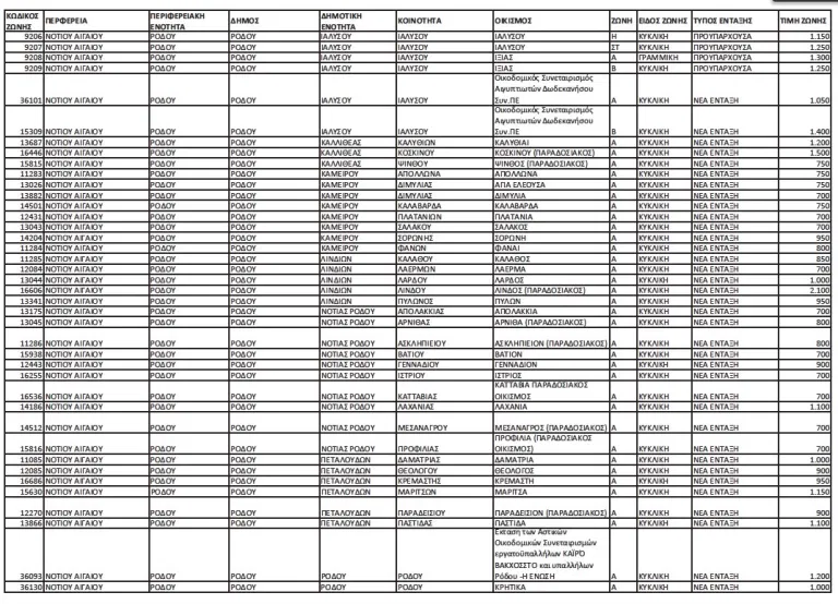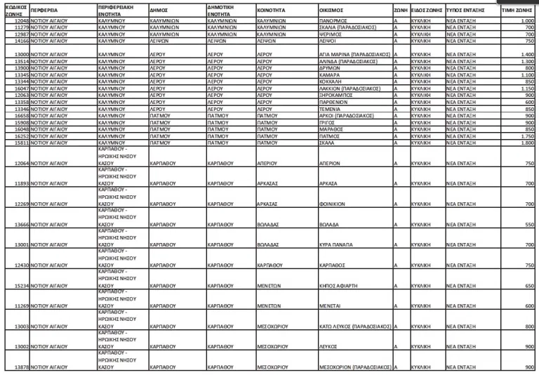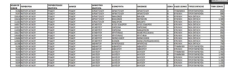 Παράλληλα, από τις νέες ζώνες, στις νέες εντάξεις εντοπίζεται αύξηση στο 40% των 3.478 ζωνών, η οποία διαμορφώνεται κατά μέσο όρο σε 26%. Αυξήσεις, μέσα από τη διαδικασία των πιστοποιημένων εκτιμητών, που εντοπίζονται σε περιοχές των οποίων η τιμή ζώνης ήταν εκτός συστήματος αντικειμενικού προσδιορισμού, όπως η Ιθάκη, από 600 σε 2.100 ευρώ (αύξηση 250%), η Ρόδος, από 700 σε 2.100 ευρώ (αύξηση 200%), η Κως, από 650 σε 1.350 ευρώ (αύξηση 108%), η Κασσάνδρα Χαλκιδικής, από 800 σε 1.550 ευρώ (αύξηση 94%), η Κεφαλλονιά, από 700 σε 1.250 ευρώ (αύξηση 79%), η Χερσόνησος Ηρακλείου, από 600 σε 1.050 ευρώ (αύξηση 75%), η Ανάβυσσος, από 1.050 σε 1.700 (αύξηση 62%), η Σκαφιδιά Ηλείας, από 650 σε 950 ευρώ (αύξηση 46%), και η Πάτμος, από 650 σε 900 ευρώ (αύξηση 38%).