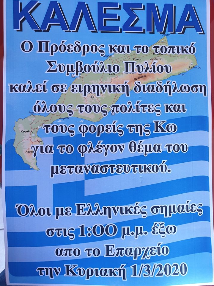 Σχετικά με την ειρηνική διαδήλωση προγραμματίζεται για αυτή την Κυριακή. Ο πρόεδρος της τοπικής κοινότητας Πυλίου Θοδωρής Πάχος και το τοπικό συμβούλιο καλεί όλους τους πολίτες σε μία ειρηνική διαμαρτυρία για το μεταναστευτικό την Κυριακή 1η Μαρτίου στη 1 το μεσημέρι στο λιμάνι. Σημείο συνάντησης το επαρχείο Κω. Θα γίνει μία ειρηνική πορεία μέχρι τα δελφίνια. Καλούνται όλοι οι πολίτες του νησιού να δώσουν το παρόν κρατώντας σημαίες ελληνικές και έχοντας ειρηνική διάθεση.