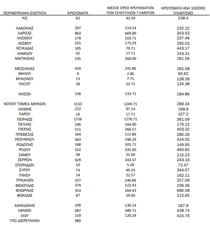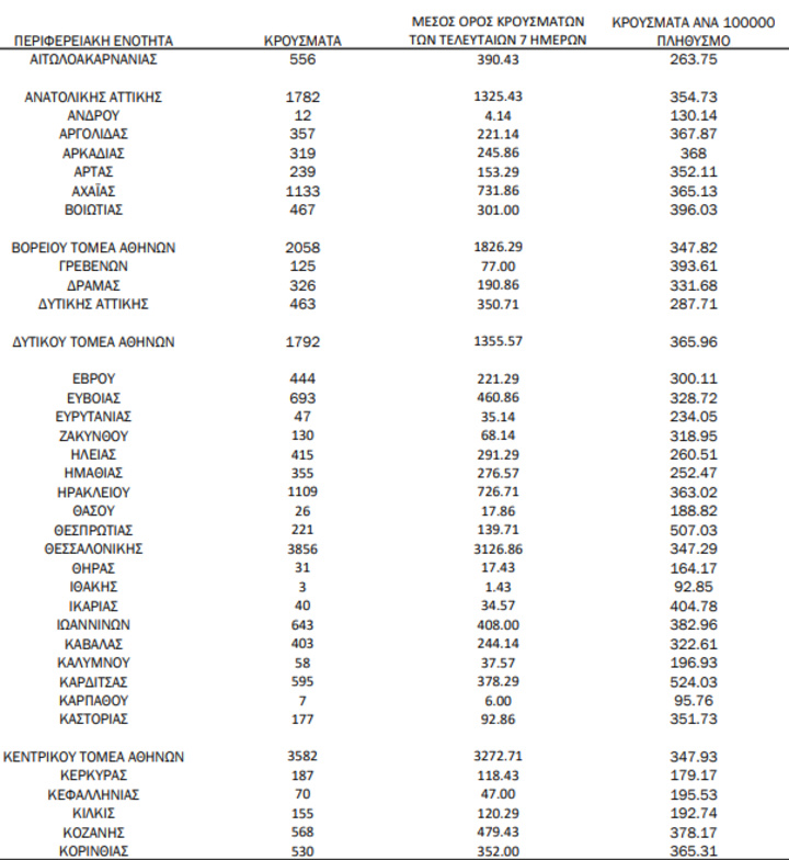Τα νέα εργαστηριακά επιβεβαιωμένα κρούσματα της νόσου που καταγράφηκαν τις τελευταίες 24 ώρες είναι 36.246 , εκ των οποίων 38 εντοπίστηκαν κατόπιν ελέγχων στις πύλες εισόδου της χώρας. Ο συνολικός αριθμός των κρουσμάτων ανέρχεται σε 1.294.741 (ημερήσια μεταβολή +2.9%), εκ των οποίων 50.3% άνδρες.