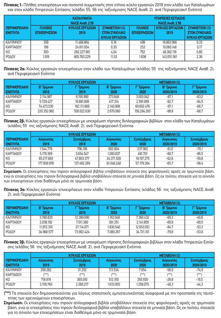 Στο σύνολο των επιχειρήσεων του κλάδου υπηρεσιών εστίασης, ο κύκλος εργασιών το γ’ τρίμηνο 2020 ανήλθε σε 1.580.633.291 ευρώ, σημειώνοντας μείωση 31,2% σε σχέση με το γ’ τρίμηνο 2019, όταν είχε ανέλθει σε 2.298.824.542 ευρώ. Η μεγαλύτερη μείωση παρατηρήθηκε στην Περιφερειακή Ενότητα Καρπάθου (69,5%), ενώ η μικρότερη μείωση (0,8%) καταγράφηκε στην Περιφερειακή Ενότητα Σερρών.
