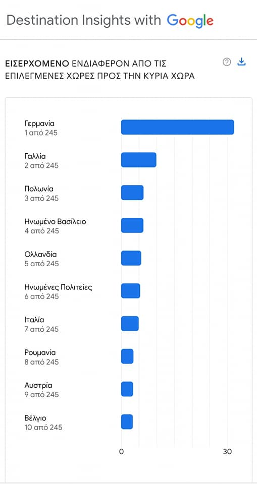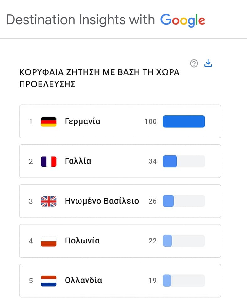 Παράλληλα η εξάρτηση του Ελληνικού τουρισμού από την Γερμανική αγορά φαίνεται να μεγαλώνει επικίνδυνα, παρά την προσπάθεια που γίνεται για να ανοίξουν άλλες μη παραδοσιακές αγορές, ώστε να μειωθεί το ρίσκο από προβλήματα που αφορούν σε συγκεκριμένες αγορές. Έτσι λοιπόν η Γερμανική αγορά παρουσιάζει τριπλάσιο ενδιαφέρον από τη Γαλλική που έρχεται δεύτερη. Στην τρίτη θέση βρίσκεται η Βρετανική αγορά παρά τα μεγάλα προβλήματα με τους ταξιδιωτικούς περιορισμούς που ισχύουν και την ισχυρή καμπάνια της Βρετανικής κυβέρνησης που προωθεί μανιωδώς τον εσωτερικό τουρισμό. Στην τέταρτη θέση είναι η Πολώνια επιβεβαιώνοντας την αγάπη των Πολωνών για την Ελλάδα. Στη πέμπτη θέση βρίσκεται η Ολλανδική αγορά, αν και η ζήτηση έχει παρουσιάσει σημαντική κάμψη μετά και την υποβάθμιση των νησιών του Ν. Αιγαίου σε πορτοκαλί.