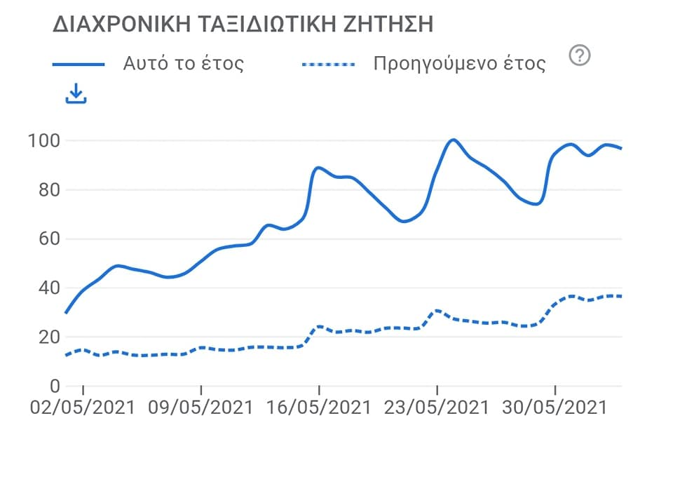 Σε ότι αφορά στο γενικό ενδιαφέρον η ζήτηση για διακοπές στην Ελλάδα είναι σαφώς αυξημένη τον Μάιο του 2021 σε σχέση με πέρσι. Παρά το γεγονός αυτό οι κρατήσεις στα ξενοδοχεία παραμένουν σε πολύ χαμηλό επίπεδο, με πολλούς ξενοδόχους να θεωρούν πλέον ακόμα και τον Ιούλιο χαμένο μήνα. Ιδιαίτερα στα ξενοδοχεία που είχαν συμβόλαια μόνο με “κλειδωμένες” αγορές όπως την Αγγλική ο φόβος για μια ολοκληρωτικά χαμένη σεζόν είναι υπαρκτός.