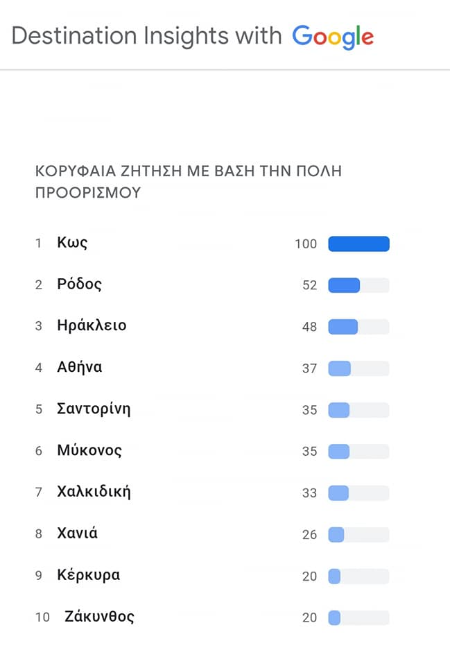 Σε πανελλαδικό επίπεδο η Κως είναι πρώτη και με διαφορά στις αναζητήσεις των τουριστών. Με σχεδόν διπλάσιο ενδιαφέρον από ότι δείχνουν οι πιθανοί τουρίστες για τη Ρόδο (που έρχεται δεύτερη) η Κως δείχνει μεγάλη δυναμική και για την συνέχεια της σεζόν.
