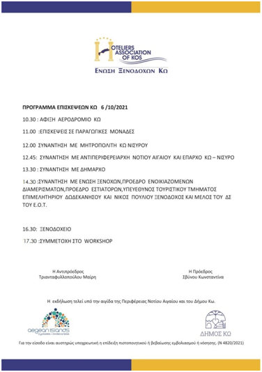 Σε συνέχεια των δράσεων της Ένωσης Ξενοδόχων Κω σχετικά με το θέμα, έχουν προσκληθεί από τις 3 έως 7 Οκτωβρίου 2021 σε εκπαιδευτική επίσκεψη στο νησί, οι φοιτητές του Μεταπτυχιακού Προγράμματος Σπουδών «Τουρισμός και Τοπική Ανάπτυξη» του Τμήματος Οικονομικών Επιστημών του Αριστοτελείου Πανεπιστημίου Θεσσαλονίκης, στο πλαίσιο του μαθήματος  «Γαστρονομικός Τουρισμός – Αγροδιατροφή».