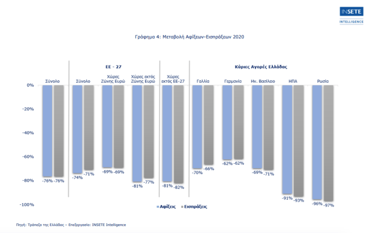 Σύμφωνα και με τα στοιχεία της Τράπεζας της Ελλάδας, το 2020, οι ταξιδιωτικές εισπράξεις εμφάνισαν μείωση κατά -76,5% σε σύγκριση με το 2019 και διαμορφώθηκαν στα 4.280 εκατ. ευρώ. Το 2020, η εισερχόμενη ταξιδιωτική κίνηση μειώθηκε κατά -76,5% και διαμορφώθηκε στις 7.375 χιλ. ταξιδιώτες, έναντι 31.348 χιλ. ταξιδιωτών την αντίστοιχη περίοδο του 2019. Συγκριτικά, την μικρότερη μείωση παρουσίασαν οι χώρες της Ζώνης του Ευρώ (- 69% στις αφίξεις και στα έσοδα).