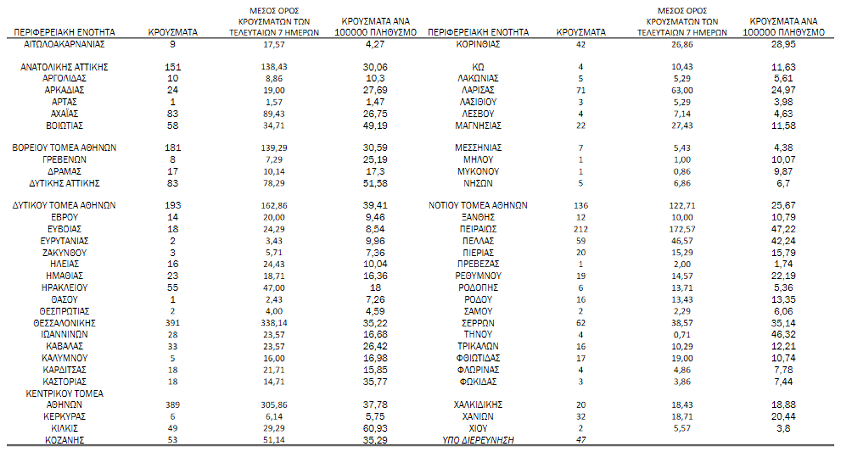 Τα νέα εργαστηριακά επιβεβαιωμένα κρούσματα της νόσου που καταγράφηκαν τις τελευταίες 24 ώρες είναι 2.801, εκ των οποίων 4 εντοπίστηκαν κατόπιν ελέγχων στις πύλες εισόδου της χώρας. Ο συνολικός αριθμός των κρουσμάτων ανέρχεται σε 293.763 (ημερήσια μεταβολή +1.0%), εκ των οποίων 51.4% άνδρες. Με βάση τα επιβεβαιωμένα κρούσματα των τελευταίων 7 ημερών, 83 θεωρούνται σχετιζόμενα με ταξίδι από το εξωτερικό και 3.003 είναι σχετιζόμενα με ήδη γνωστό κρούσμα.