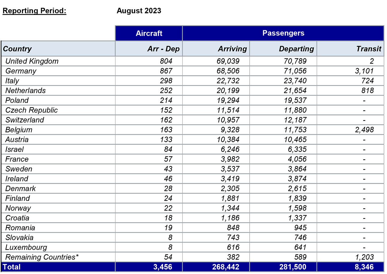 Οι αφίξεις από το εξωτερικό για τον Αύγουστο ήταν 268.442, ενώ το 2022 ήταν 256.395.