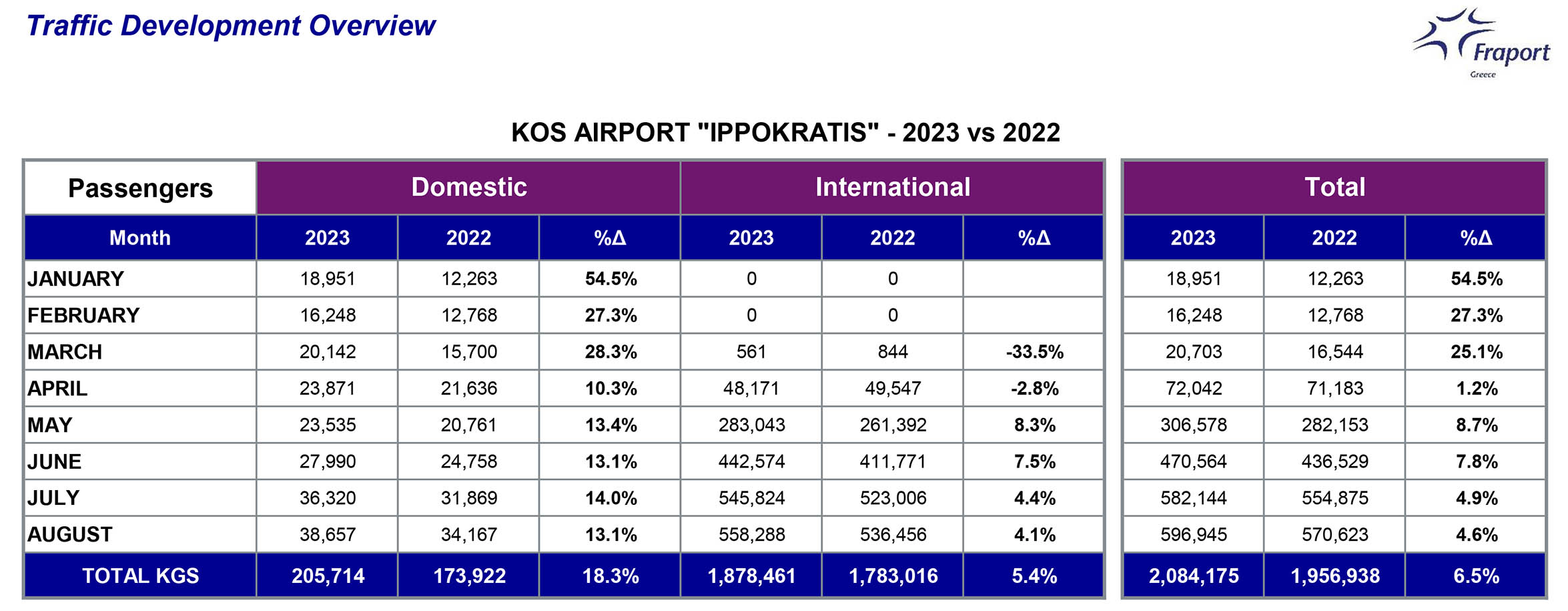 Σύμφωνα με τα επίσημα στοιχεία της Fraport, μέσω του αεροδρομίου Κω τους πρώτους οκτώ μήνες του 2023 διακινήθηκαν 2.084.175 επιβάτες, έναντι 1.956.938 επιβατών το αντίστοιχο χρονικό διάστημα του 2022.