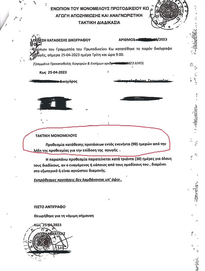 Σημείωση: σας αποστέλλουμε την πρώτη σελίδα από την αγωγή αποζημίωσης που κατατέθηκε στις 25/4/2023.