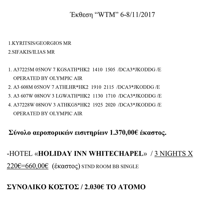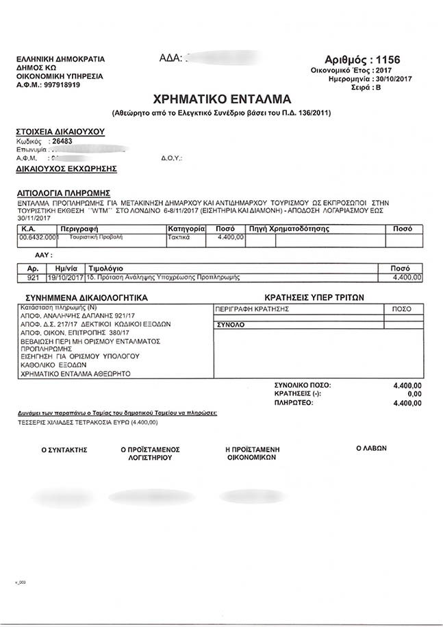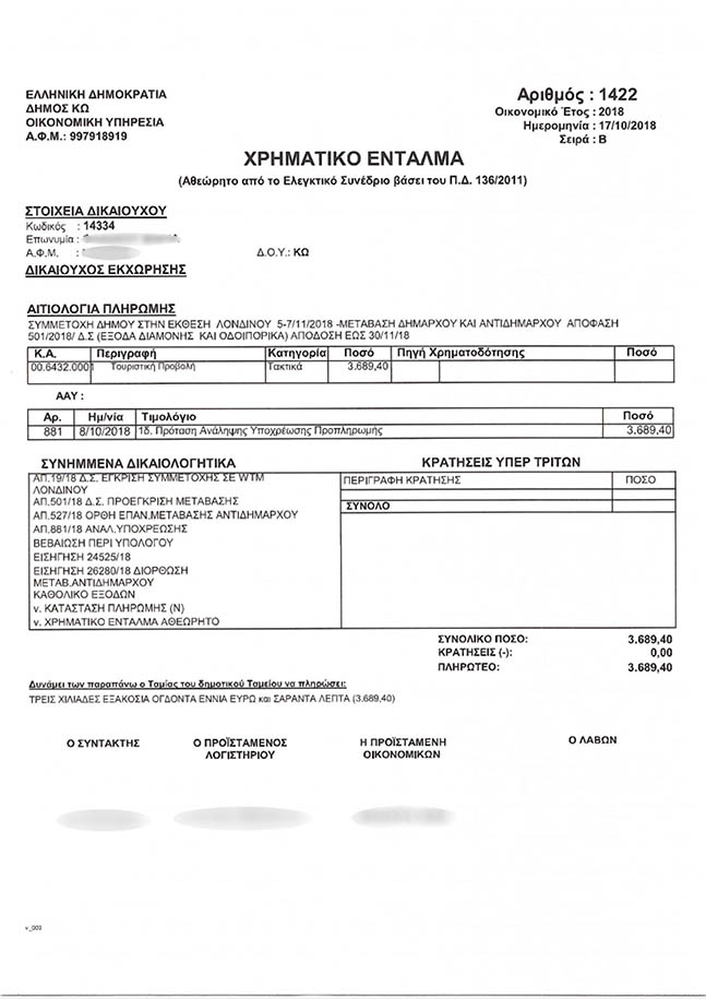 Σημείωση: Αναγκαζόμαστε να δώσουμε στη δημοσιότητα έγγραφα και εντάλματα για τα έξοδα των κ.κ. Σιφάκη και Κυρίτση στο Λονδίνο, τα έτη 2017 και 2018, για να αντιληφθούν οι συμπολίτες μας ότι οι συγκεκριμένες δαπάνες είναι ακριβώς ίδιες με αυτές της Αντιδημάρχου κας Βλάχου, αφού έτσι προβλέπεται από το θεσμικό πλαίσιο.