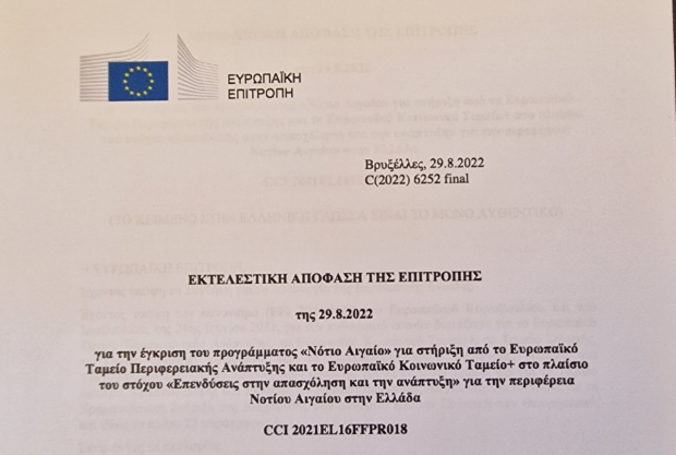 Μια νέα σελίδα προκλήσεων, ευκαιριών και δυνατοτήτων, με στόχο την ενίσχυση της προοπτικής ανάπτυξης των νησιών του Νοτίου Αιγαίου, ανοίγει με την έγκριση στις 29/8/2022 από την Ευρωπαϊκή Επιτροπή, του Περιφερειακού Προγράμματος Νοτίου Αιγαίου 2021-2027.