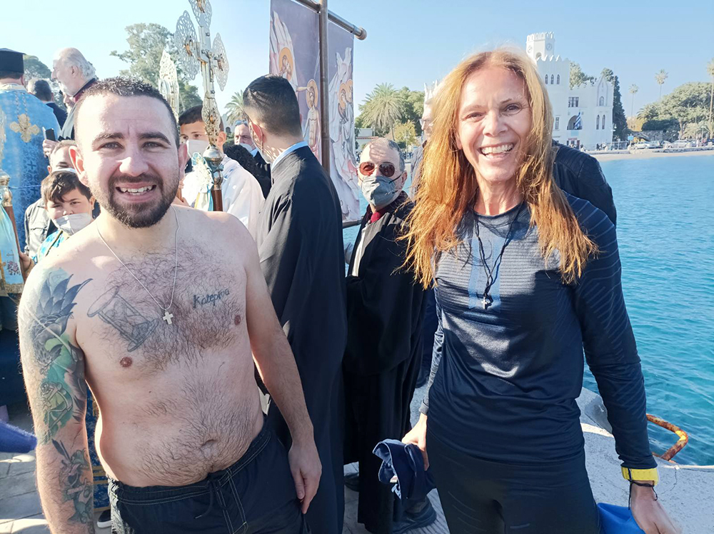 Ανάμεσα στους βουτηχτές και μια γυναίκα, η 52 χρονη Βασιλική Τσίγκα από την Πάτρα που εργάζεται στο ΕΚΑΒ στην Κω.