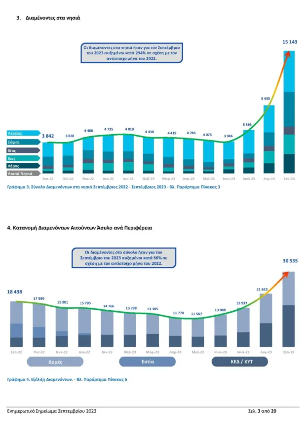 Αντίστοιχα πίεση δέχονται και οι δομές φιλοξενίας, αφού ενώ το πρώτο 9μηνο του 2022 υπήρχαν 18.438 διαμένοντες συνολικά στις 33 δομές ανά την επικράτεια, ο αριθμός αυτός έχει φτάσει στους 30.535 για το 2023. Μάλιστα, ποσοστιαία η αύξηση είναι 66% στις δομές της ενδοχώρας και 294% στα νησιά.
