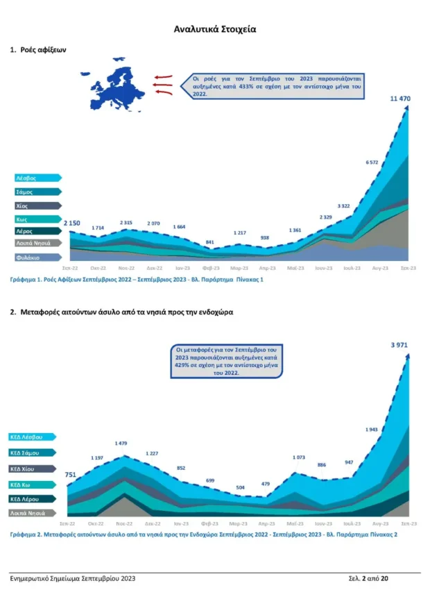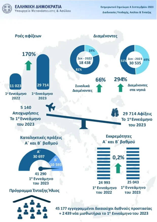Συγκεκριμένα, σύμφωνα με το ενημερωτικό σημείωμα του Υπουργείου Μετανάστευσης και Ασύλου για τον μήνα Σεπτέμβριο, οι ροές αφίξεων παράνομων μεταναστών στη χώρα για το πρώτο 9μηνο του 2023 είναι αυξημένες κατά 170% σε σχέση με το αντίστοιχο διάστημα του 2022. Σε απόλυτους αριθμούς αυτό σημαίνει 29.714 αφίξεις έναντι μόλις 11.023 το 2022.
