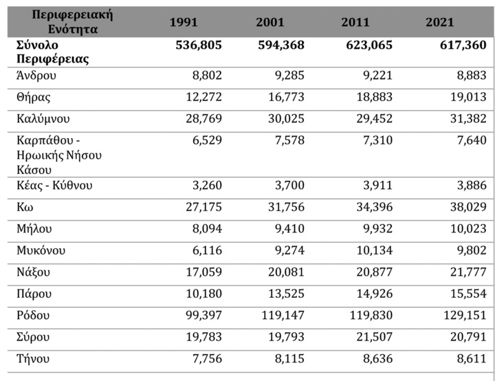 Από τις 13 περιφέρειες της χώρας, στις 12 σημειώθηκε πτώση στον πληθυσμό, ενώ σε μία, στο Νότιο Αιγαίο, υπήρχε αύξηση. Ειδικότερα η απογραφή για το Νότιο Αιγαίο τις προηγούμενες δεκαετίες είχε δείξει τα εξής: