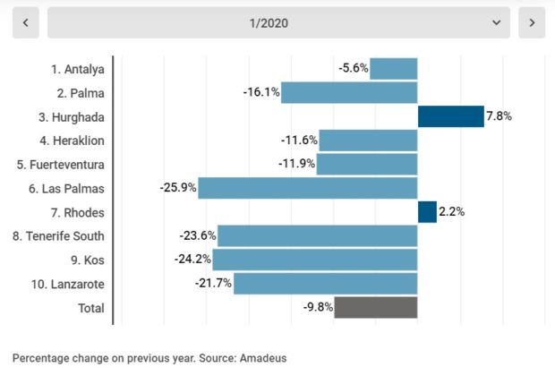 Η Αττάλεια σημείωσε πτώση 5.6% στα πακέτα διακοπών και τις κρατήσεις μέσω Online Travel Agencies.Oι κορυφαίοι ισπανικοί προορισμοί σημείωσαν και αυτοί πτώση: Η Πάλμα -16.1%, η Fuerteventura -11.9%, η Las Palmas -25.9%, η νότια Tenerife -23.6% και το Lanzarote -21.7%.