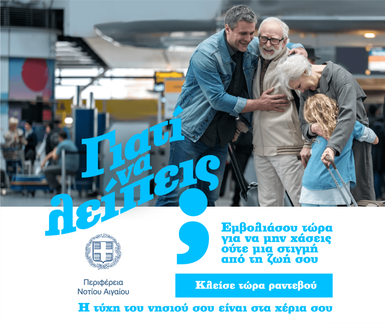 Για την καμπάνια «Γιατί να λείπεις από τη ζωή σου; Η τύχη του νησιού σου είναι στο χέρι σου», η Περιφέρεια Νοτίου Αιγαίου συνεργάστηκε με την εταιρεία «MullenLowe Επικοινωνίες» του παγκόσμιου ομίλου McCann, η οποία έφερε εις πέρας το σχεδιασμό και παραγωγή της μέσα σε πολύ στενά χρονικά περιθώρια. Θα βρίσκεται στον αέρα (τηλεόραση, ραδιόφωνο, ψηφιακά μέσα) για τουλάχιστον οκτώ εβδομάδες ως καμπάνια κοινωνικού μηνύματος.