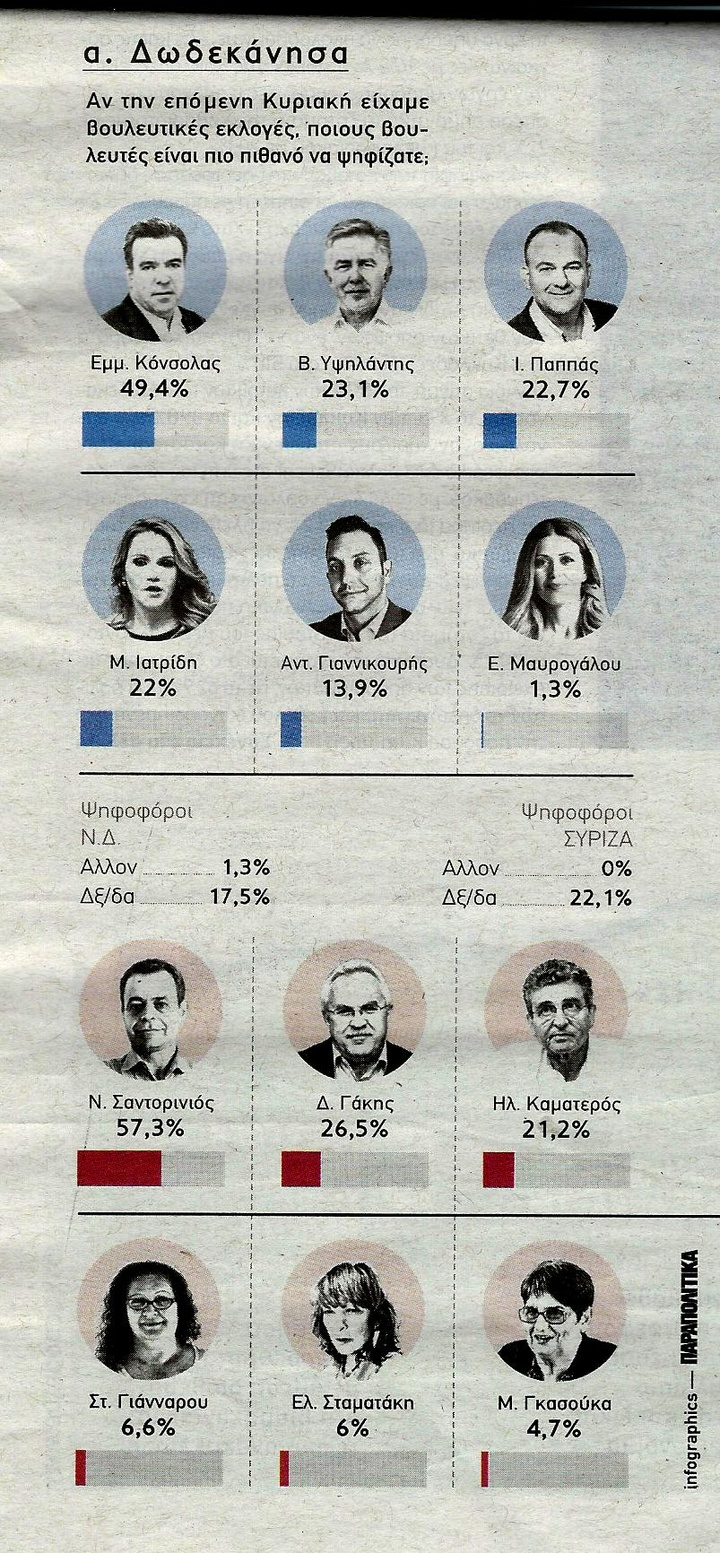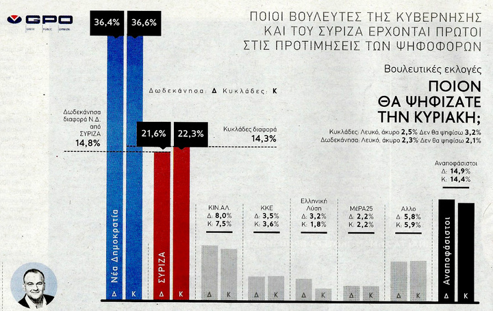 Σαρώνει σε Δωδεκάνησα και Κυκλάδες η Νέα Δημοκρατία, σύμφωνα με δημοσκόπηση της εταιρείας GPO που δημοσιεύτηκε χθες στην εφημερίδα «Παραπολιτικά») στο (ένθετο “Secret”).