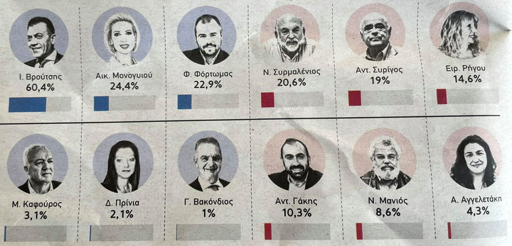Στον ΣΥΡΙΖΑ προηγείται καθαρά ο κ. Σαντορινιός και ακολουθούν οι κ. Γάκης και Καματερός. Στις Κυκλάδες καταγράφεται για τη Ν.Δ. η ισχυρή παρουσία του κ. Βρούτση, με την κ. Μονογυιού και τον κ. Φόρτωμα να ακολουθούν, ενώ στο κόμμα της αξιωματικής αντιπολίτευσης ο ανταγωνισμός είναι έντονος μεταξύ του κ. Συρμαλένιου και του κ. Συρίγου.