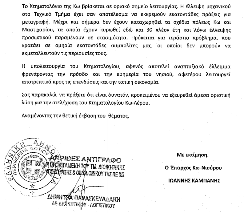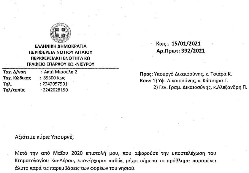 Επιστολή του Επάρχου προς τον Υπ. Δικαιοσύνης με θέμα τη στελέχωση του κτηματολογίου Κω - Λέρου