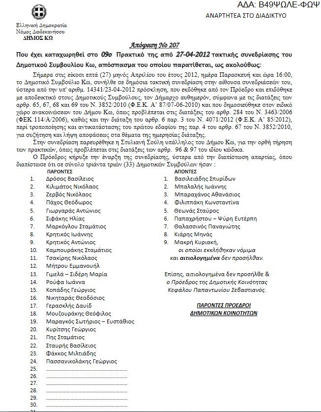 Από το Πρακτικό 4/2013 της συνεδρίασης της Εκτελεστικής Επιτροπής του Δήμου Κω