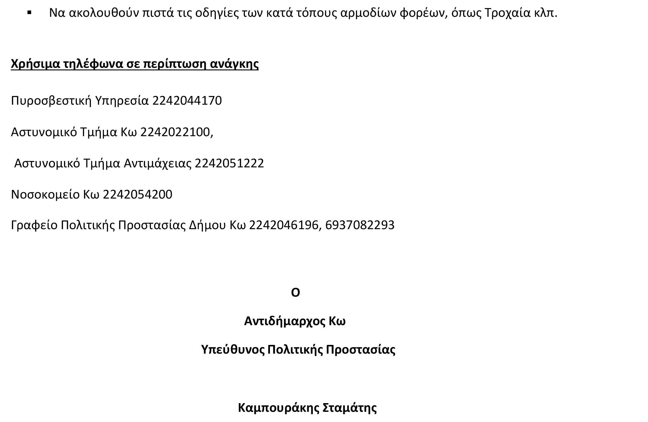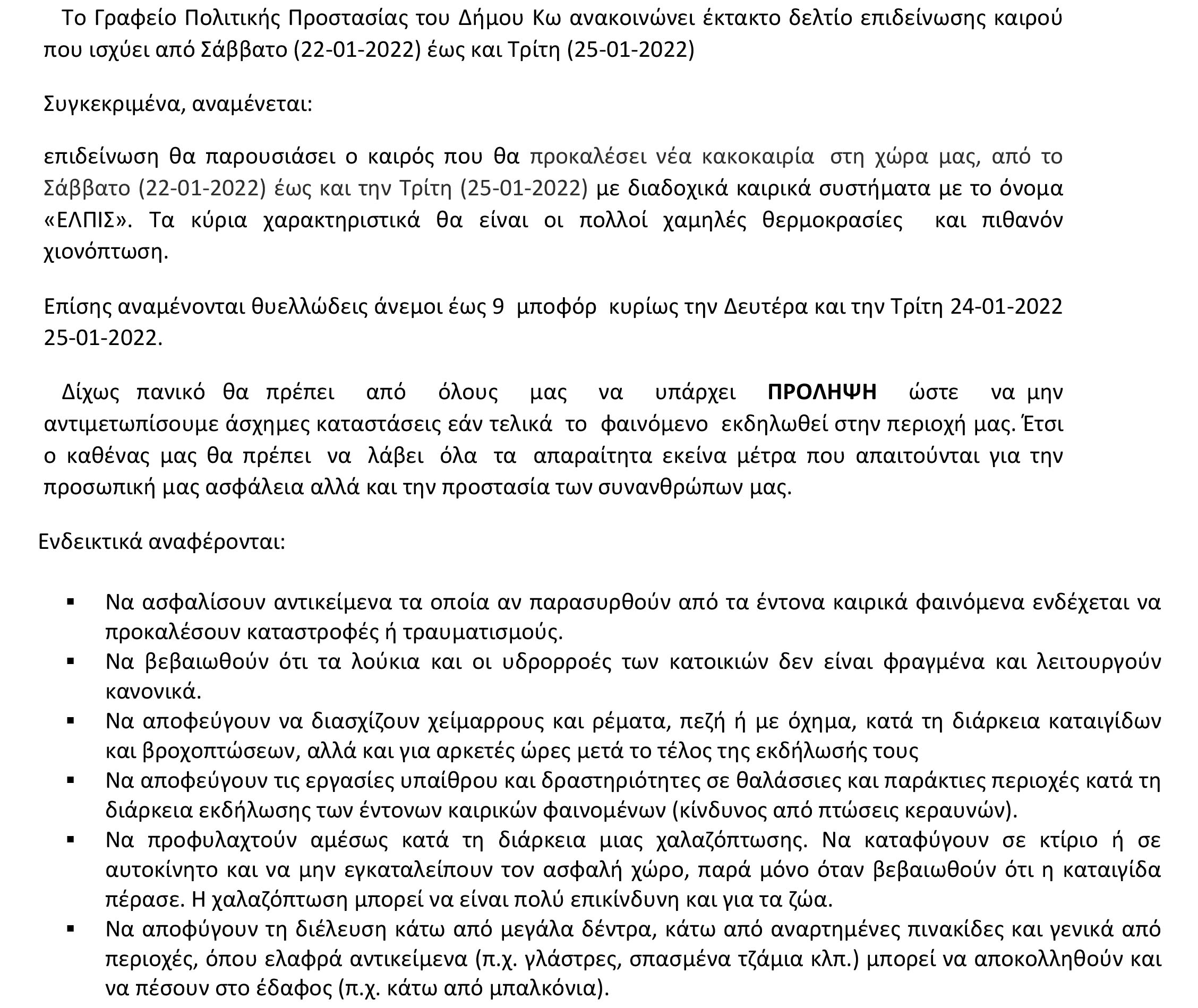ΠΟΛΙΤΙΚΗ ΠΡΟΣΤΑΣΙΑ ΚΩ: ΕΚΤΑΚΤΟ ΔΕΛΤΙΟ ΕΠΙΔΕΙΝΩΣΗΣ ΚΑΙΡΟΥ - ΠΙΘΑΝΟΤΗΤΑ ΧΙΟΝΟΠΤΩΣΗΣ