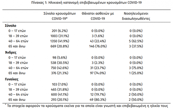 Αναφορικά με τους νεκρούς 61 (31.8%) είναι γυναίκες και οι υπόλοιποι άνδρες. Η διάμεση ηλικία των θανόντων συμπολιτών μας ήταν τα 76 έτη και το 95.8% είχε κάποιο υποκείμενο νόσημα ή/και ηλικία 70 ετών και άνω.