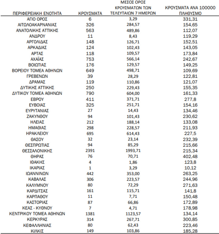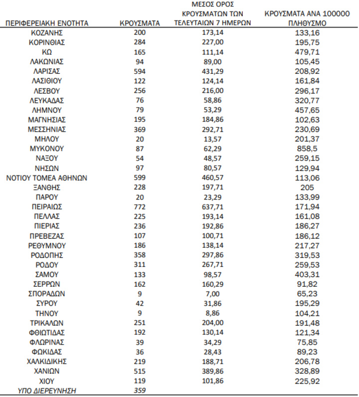 Με βάση τα επιβεβαιωμένα κρούσματα των τελευταίων 7 ημερών, 376 θεωρούνται σχετιζόμενα με ταξίδι από το εξωτερικό και 2.211 είναι σχετιζόμενα με ήδη γνωστό κρούσμα.