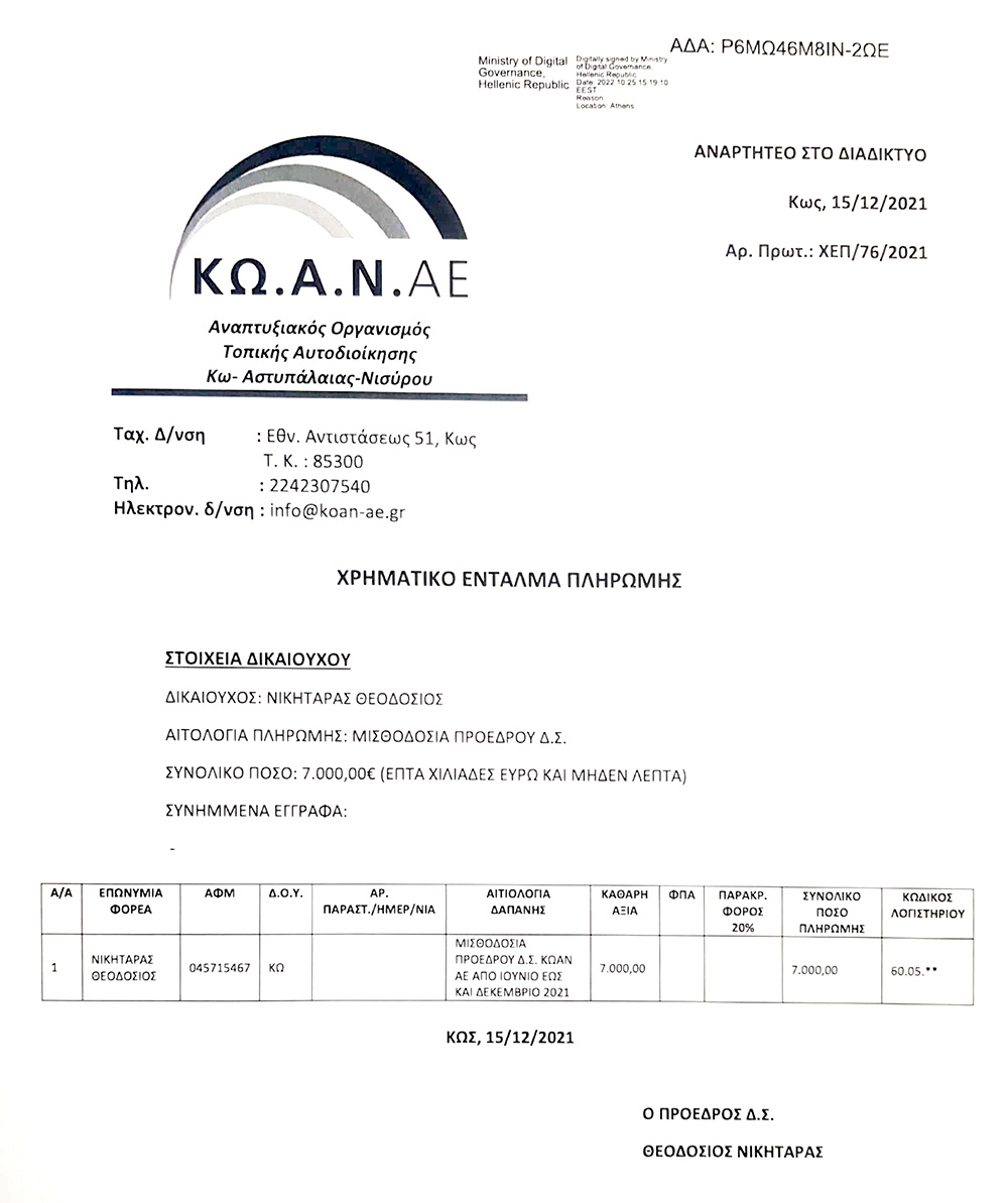 Από τα λεφτά των δημοτών λοιπόν, που πληρώνει ο δήμος, σε μια ανύπαρκτη ουσιαστικά εταιρεία που ο ίδιος δημιούργησε εισπράττει ως μισθό Προέδρου ένα χιλιάρικο το μήνα!!! Και βέβαια εισπράττει και τον μισθό του Δημάρχου….