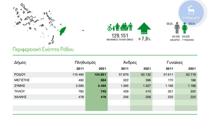 Στο νησί της Ρόδου διαμένουν επίσημα 124.851 άτομα (64.526 άνδρες και 64.625 γυναίκες) ενώ η αύξηση που παρατηρείται συγκριτικά με την απογραφή του 2011 είναι της τάξης του 7,8%.